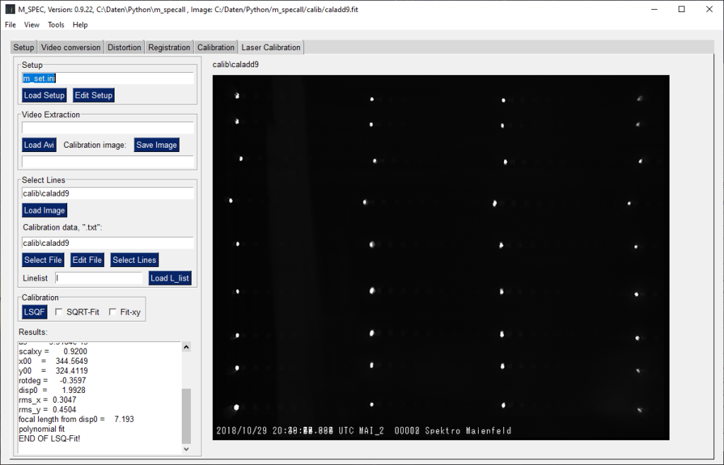 For the laser calibration you have to set the instrument parameters, load a calibration image, measure the lines in each spectrum and do a least square fit of the measured lines positions. This gives the parameters for the orthographic transformation of the meteor spectra images: