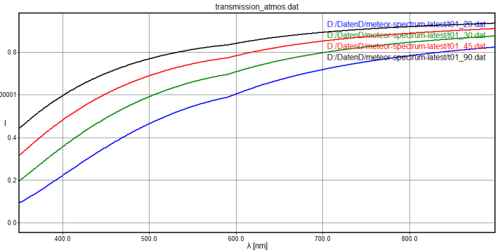 Another year has passed with many meteor spectra. Here (meteor spectra 2023) is the report of these spectra, recorded at Maienfeld during the year 2023. The spectra were recorded with a DMK 33GX249 camera from The Imaging Source (thanks to Roger Spinner for giving me this camera), equipped with a Kowa LM16HC f: 16mm F/1.4 lens and a Thorlabs 50x50mm, 600l/mm grating. All the spectra have been analysed with my Python script, based on the image transformation to an orthographic projection, freely available from Github. As last year, spectra have been analyzed by fitting synthetic spectra to to response corrected 1st order spectra when meaningful.